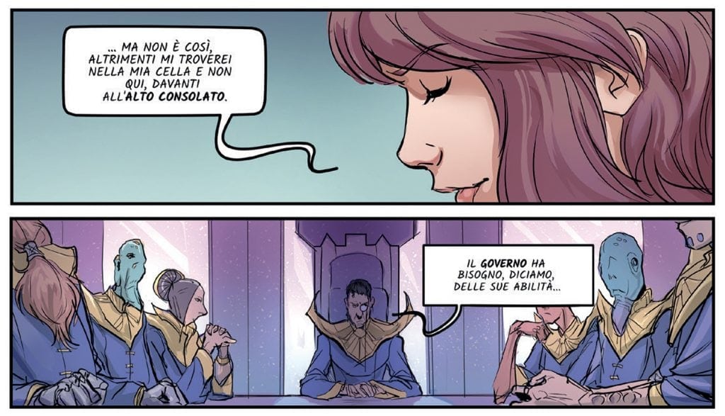 Come esordio nel mondo della Nona Arte, “Helen Bristol – L’anima di Kairos” è piuttosto ispirato: si tratta infatti della tesi di laurea di Elisa Romboli (disegni, colori e lettering) – proposta all’Accademia delle Belle Arti di Bologna – che, con Marco Scali ai testi, ci racconta di una squadra di fuorilegge tutta al femminile, o quasi, se non si considera Sakari, l’unico maschio, che soffre drammaticamente di vertigini… piuttosto scomodo per chi ha scelto di fare del pericolo il proprio mestiere.