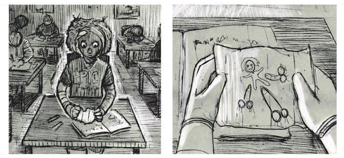 Il tratto tagliente e graffiante, dove i chiaroscuri dominano e non c’è bisogno di colori, vede un’elaborata alternanza tra colori pieni e riempimento tramite linee. I tratti delle persone, le loro stesse figure, a volte vengono trasfigurate rivelando come vengono percepite o come sono realmente. JiokE gioca, spaventa, fa ridere, ponendo l’accento su come le cose possano essere percepite diversamente a seconda di quello che accade: prima una persona può rivelarsi bella, dolce, accondiscendente, per poi assumere un aspetto quasi mostruoso.